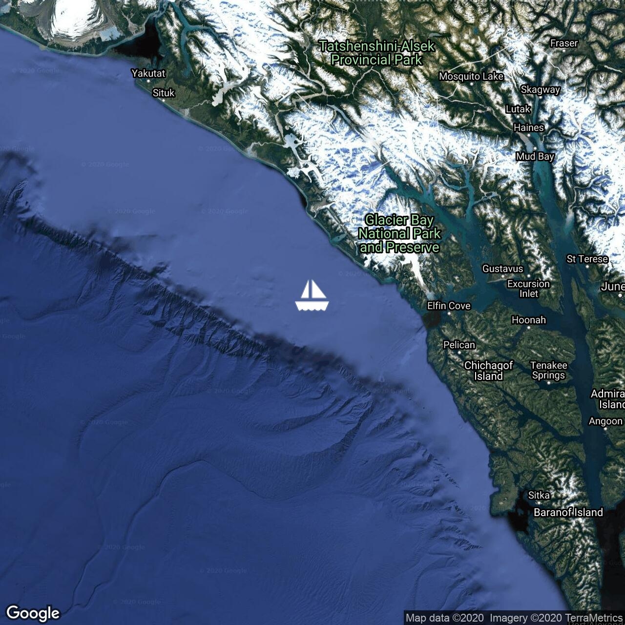 50 nMiles from Elfin Cove. Will stop and head to Glacier Bay