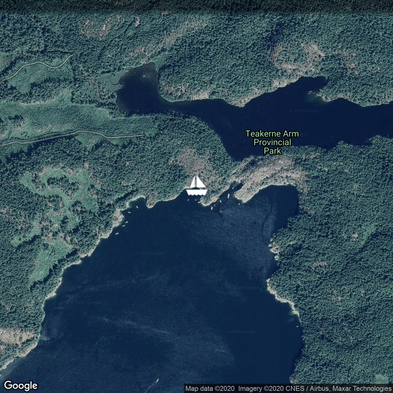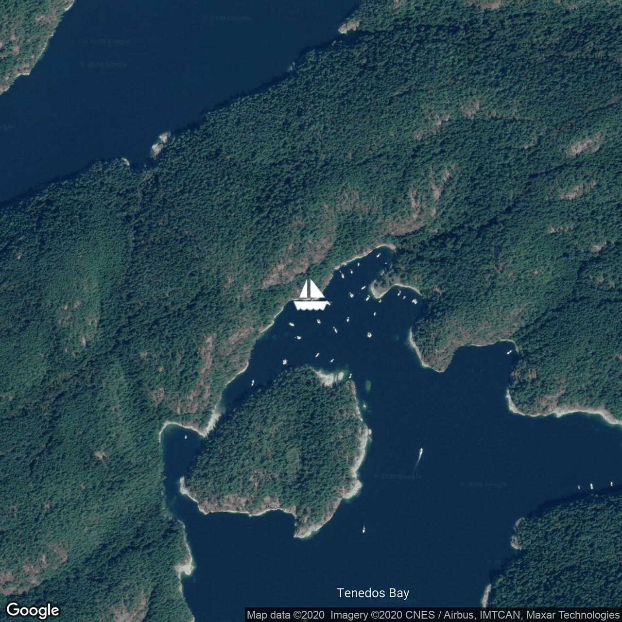 <p>Anchored with stern tie into a busy Princess Cove on Wallace Island. Busy boat with three adults and eight kids onboard.</p>