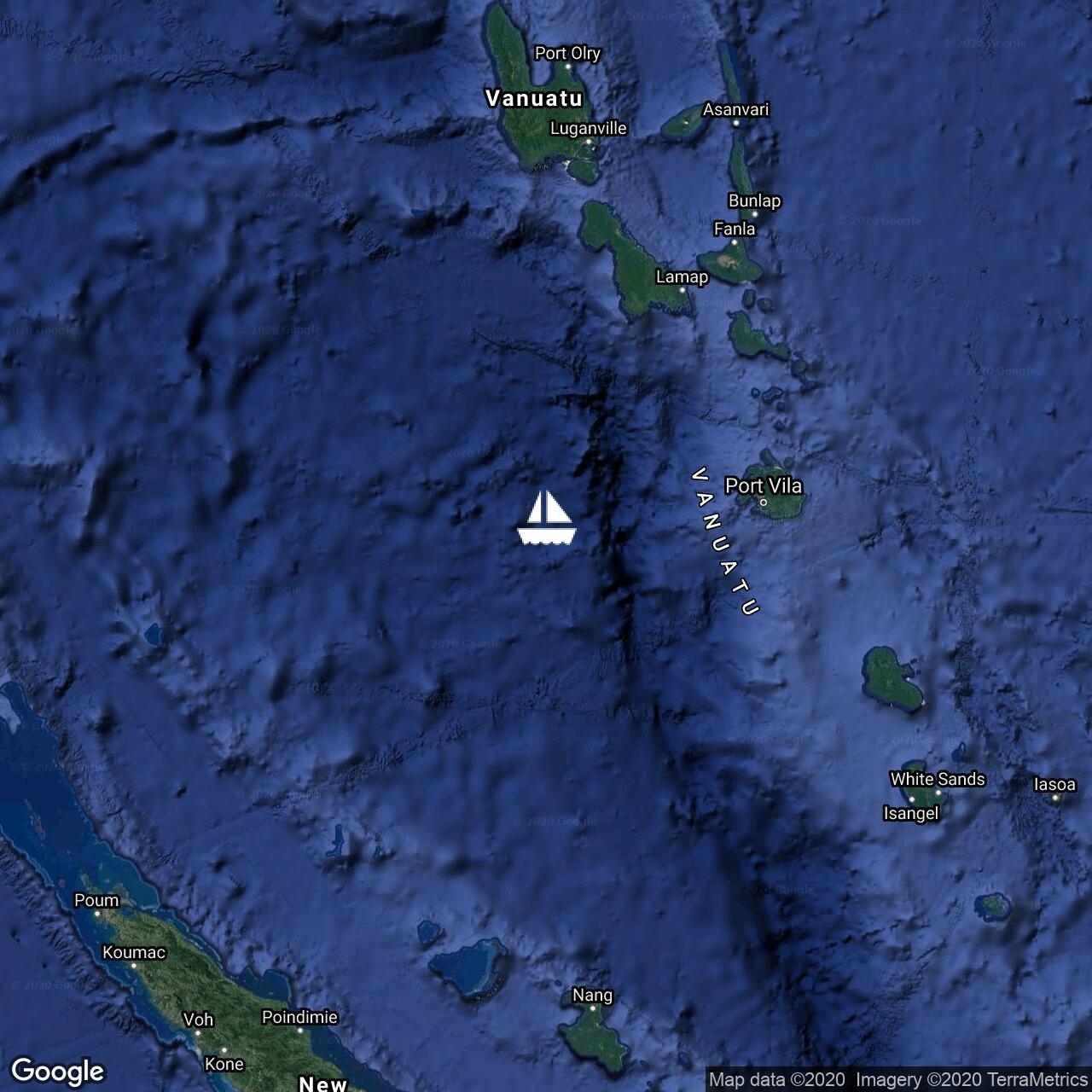 Anchored In Analgawat Aneityum. Great passage 7 days 4 hours no wind over 25 knts encountered.