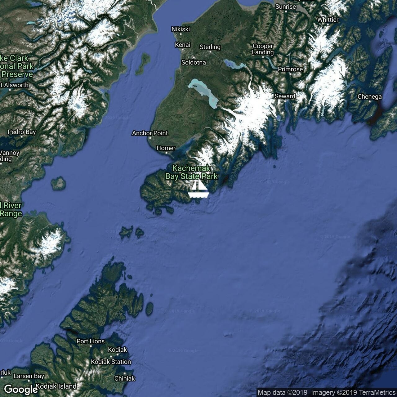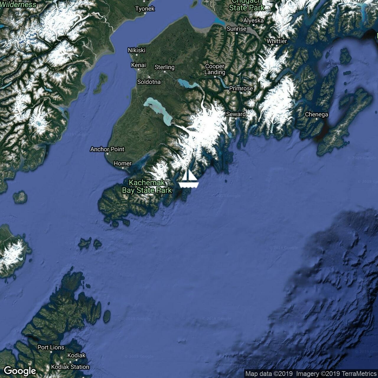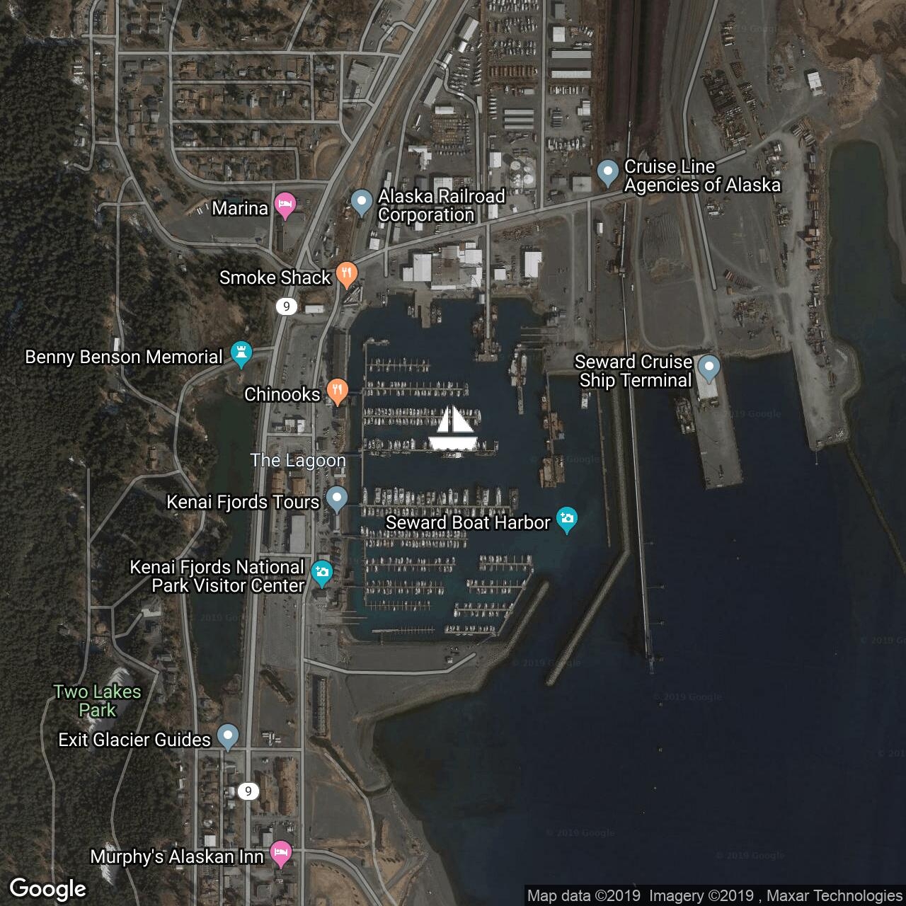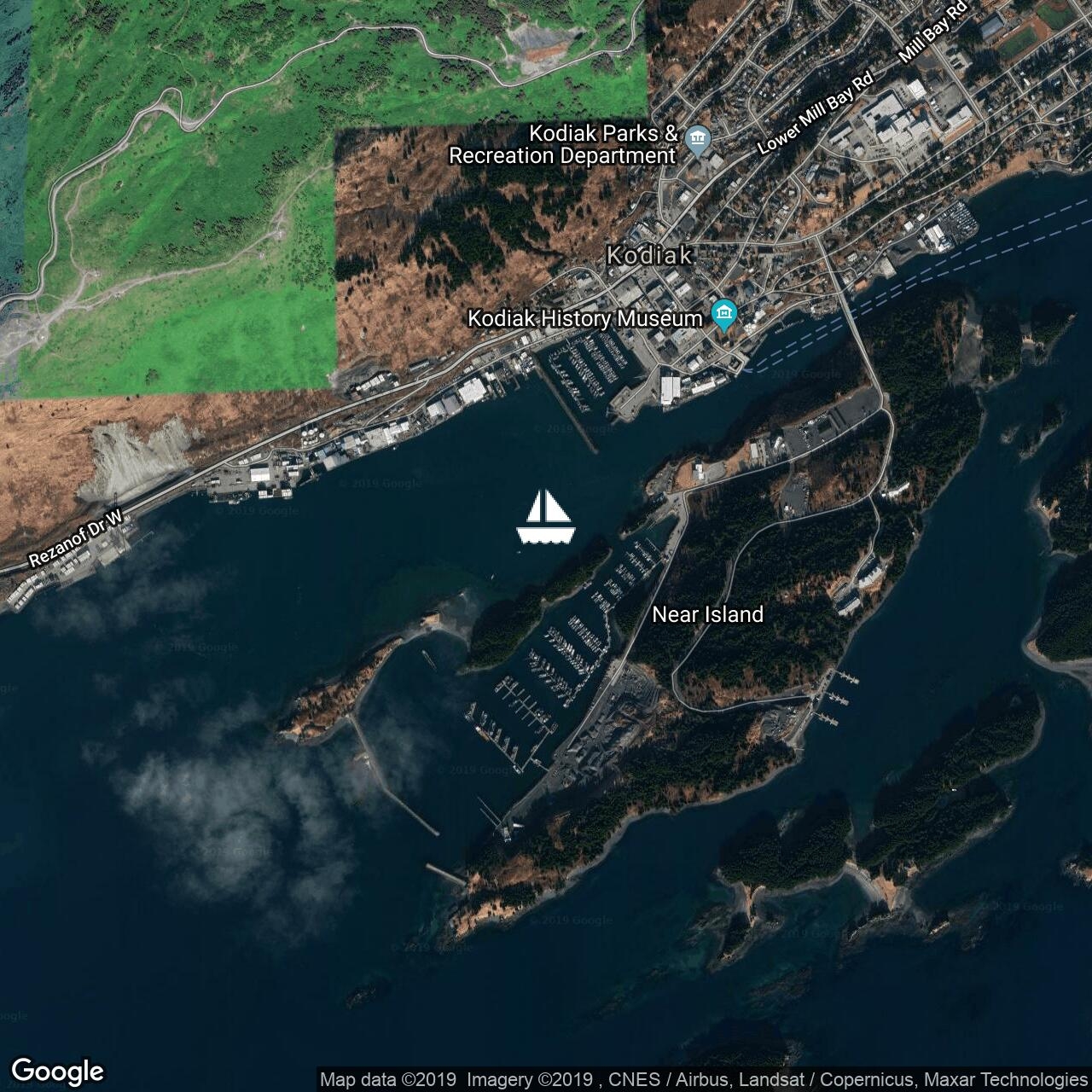 Me 11/09/2019. Arrivés à Kodiak, ancrés entre les bateaux de pêche et une petite colonie de loutres de mer.