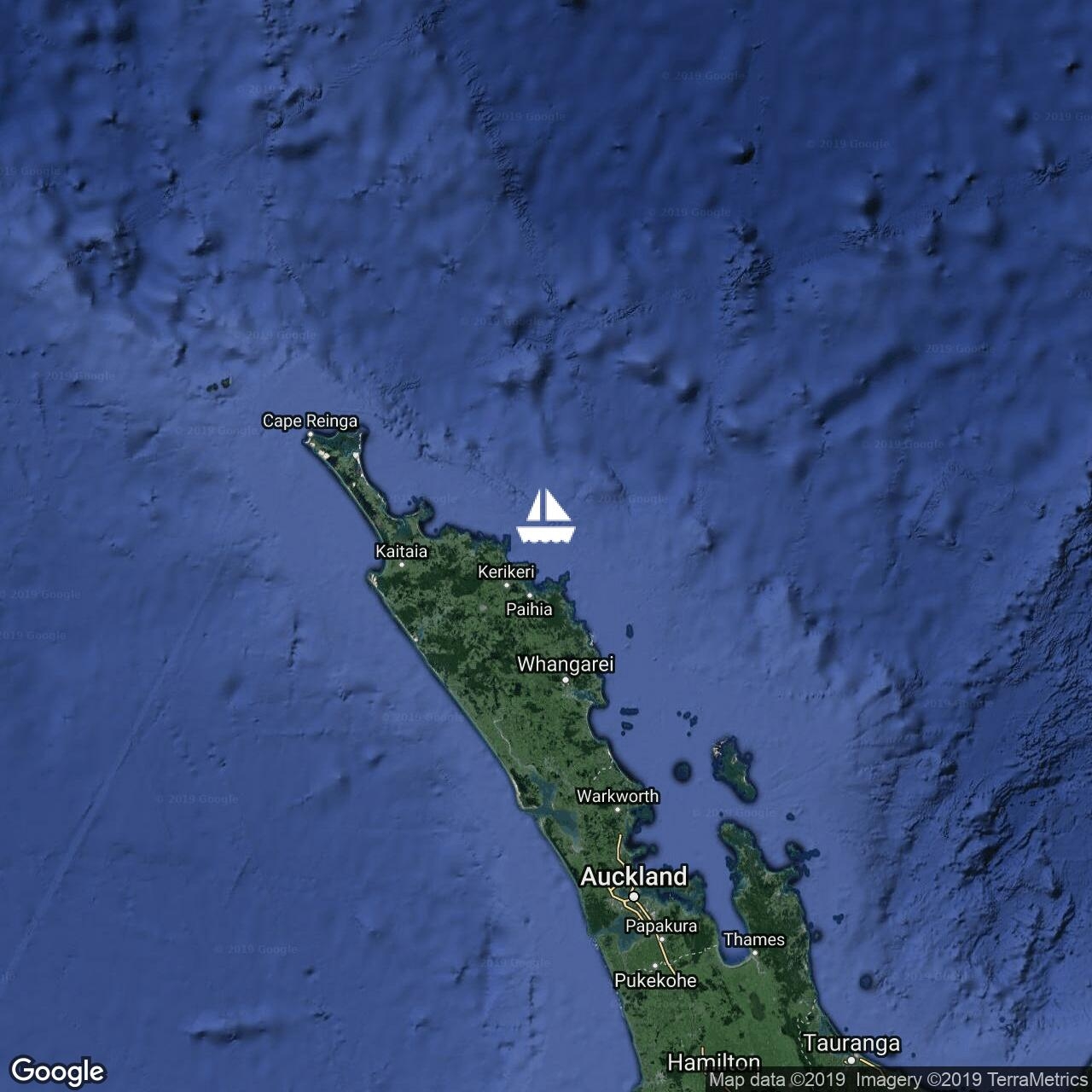 Making great time toward Opua in lovely conditions. Blue skies with no clouds except for a Long White Cloud over NZ.