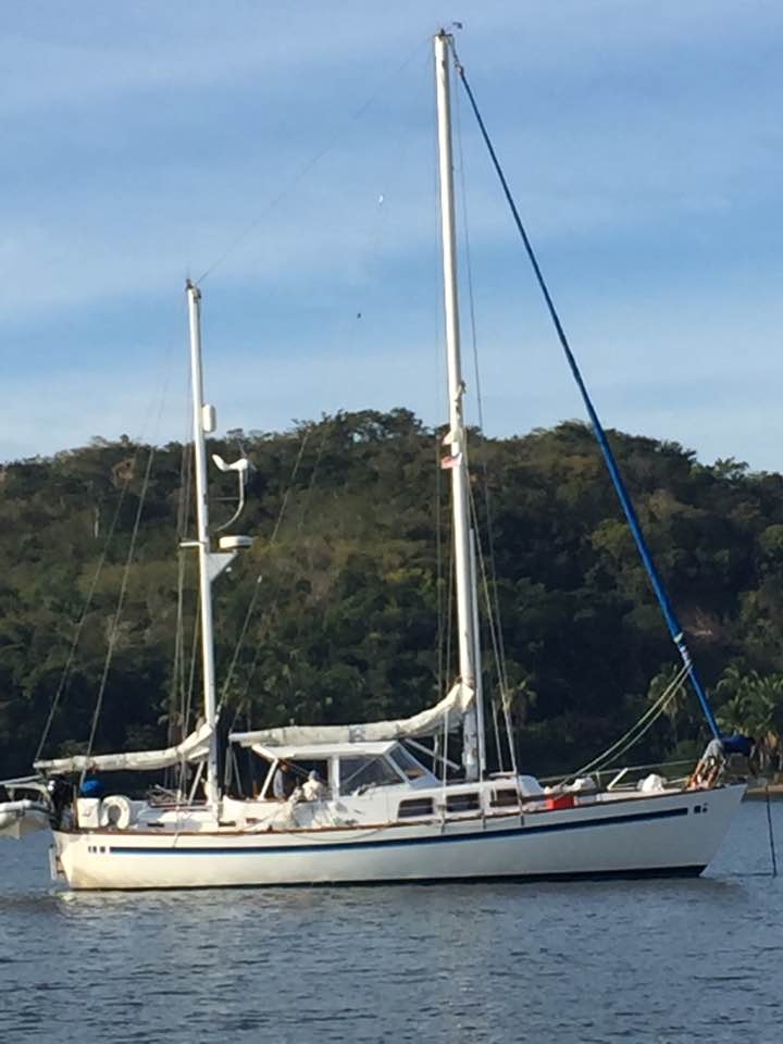 1978 45 foot Morgan 452 ketch rig white with blue stripe.